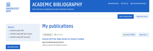 Vervolgens kan je dan publicaties van Biblio naar ORCID zenden via My publication list. Deze lijst vind je door rechts bovenaan op je naam te klikken, eens je ingelogd bent.